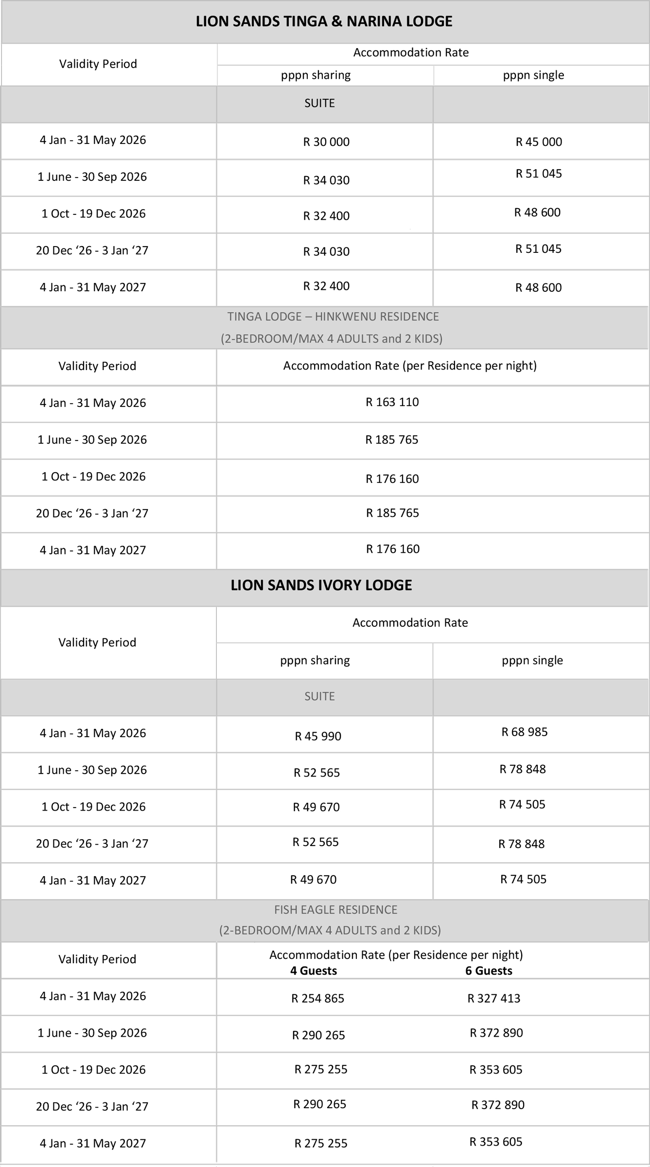 screenshot of accommodation rates of Lion Sands Game Reserve for 2026