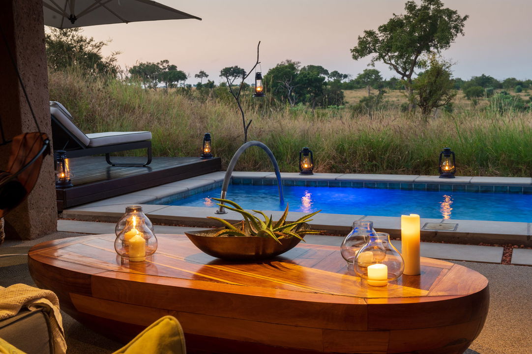 There are 22 spacious suites, each with air conditioning, glass-fronted indoor showers, private patios, and day beds that can convert to child-friendly beds. The decor blends modern comfort with African touches, and suites are designed for privacy and bushveld views. Features include a dedicated kids’ centre with activities and pools, open-sided viewing decks overlooking a waterhole, and the exclusive Mandleve Suite for honeymooners, complete with a private pool and outdoor shower.