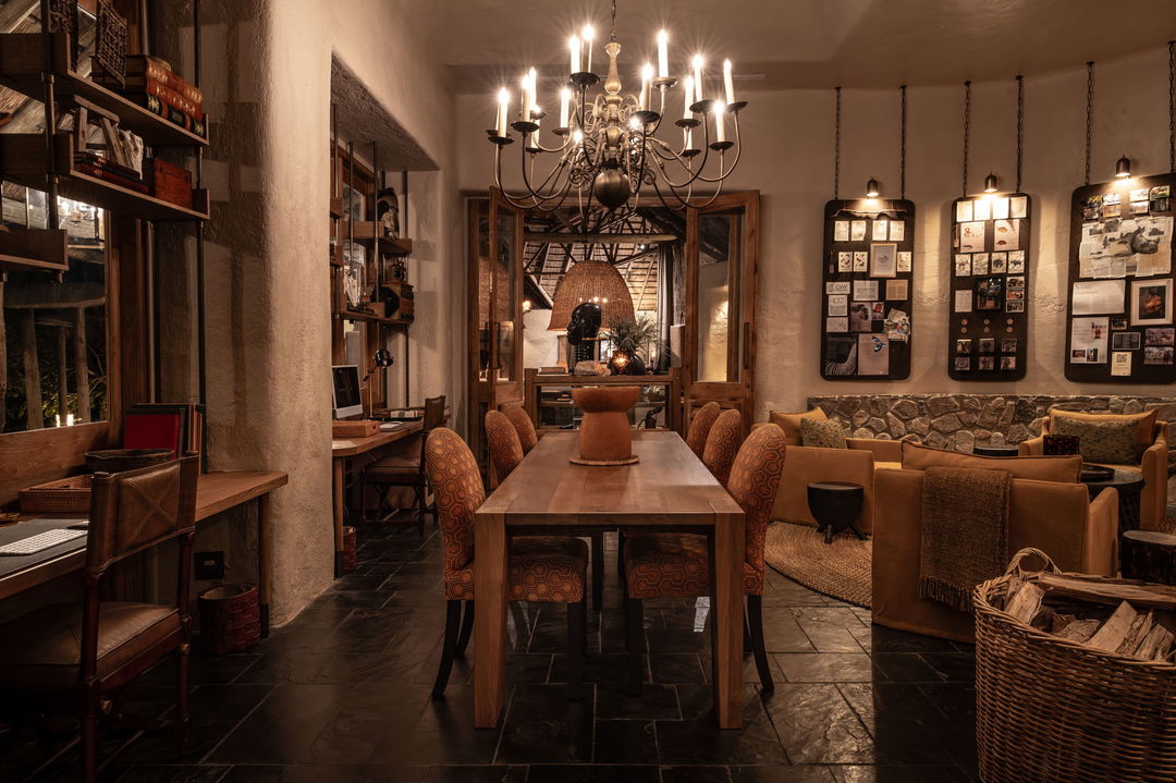 The suites feature a blend of vintage campaign furniture, antiques from the Bailes family collection, and contemporary African art, with interiors inspired by natural hues such as indigo, ochre, and ecru. All suites have en-suite bathrooms with indoor and outdoor showers, double-sided fireplaces, and spacious living areas.