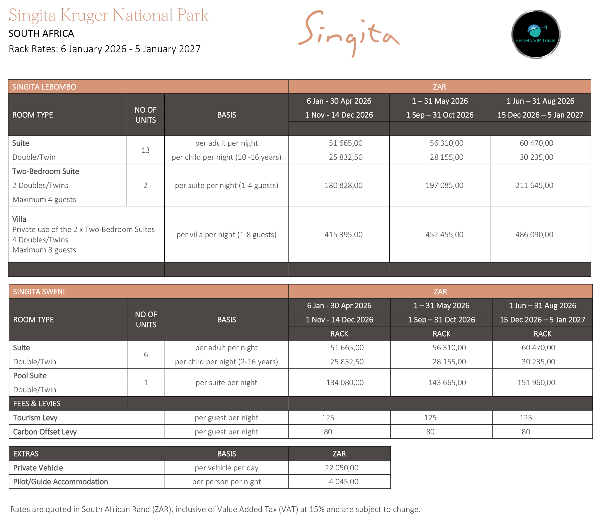 Upon confirmation of your Singita reservation, Secrets VIP guests are also treated to one night complimentary stay at The Peermont D’Oreale Grande Hotel at Emperors Palace with return airport transfers.
