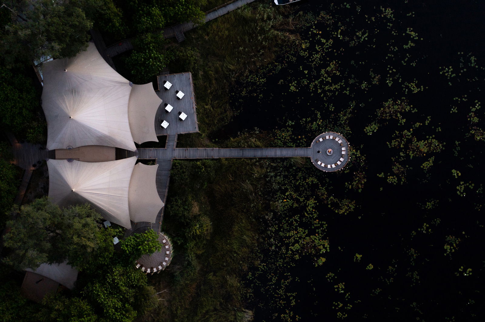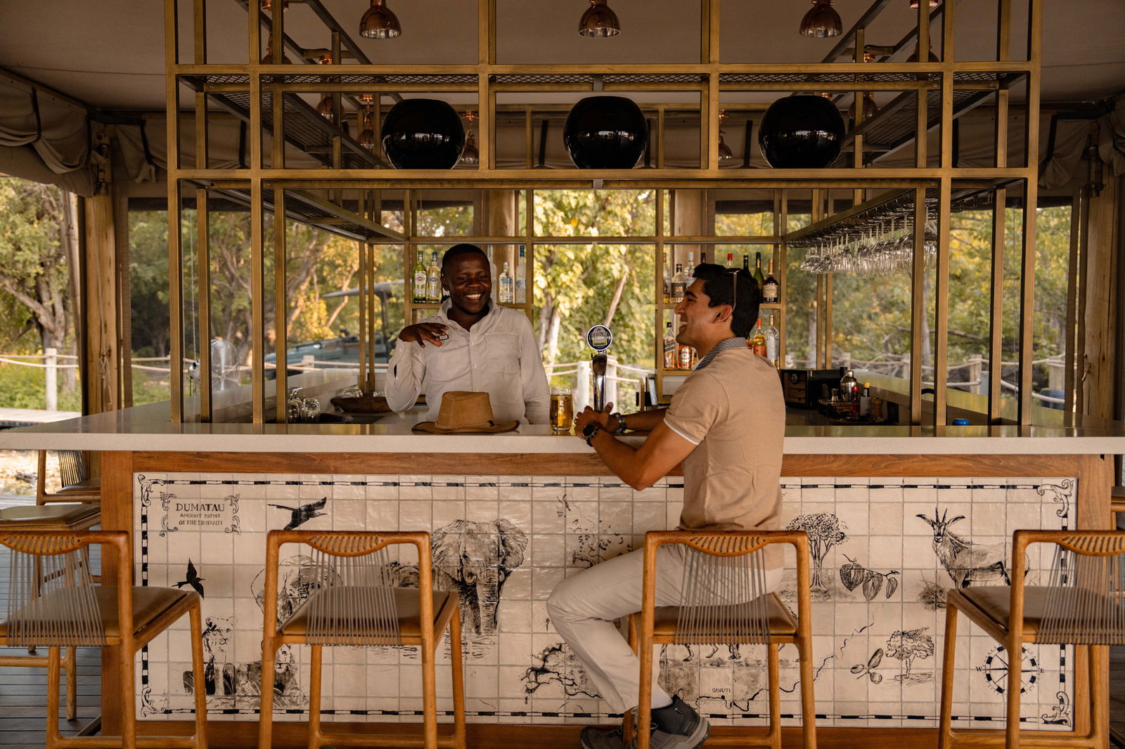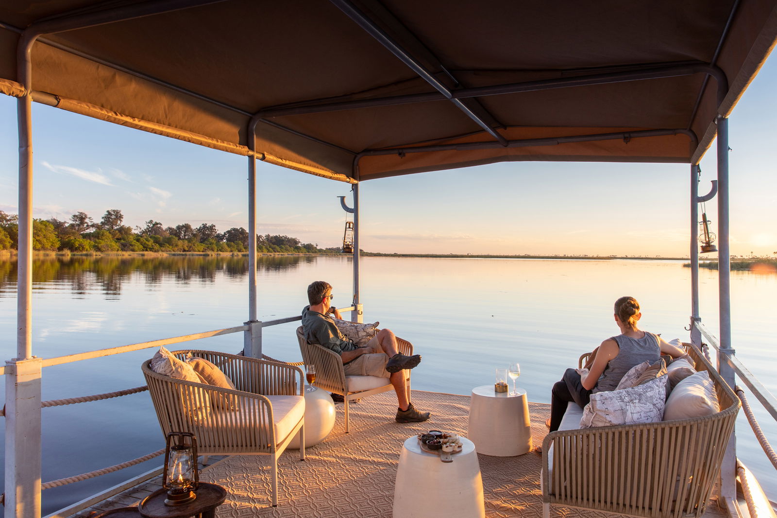 The outdoor stargazing and floating fire deck represents one of DumaTau's most romantic features, seemingly immersed in the Linyanti River itself. This magical venue serves as the perfect setting for sundowner cocktails while watching wildlife come to drink as the African sky transforms through spectacular sunset colors.