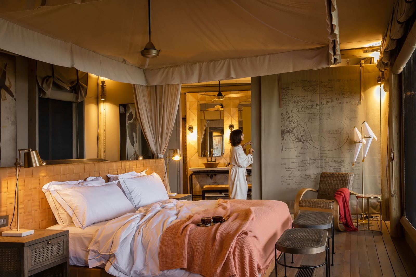 DumaTau features eight spacious twin/double tented suites, each an ultra-luxurious sanctuary spanning 142 square meters. These magnificent accommodations are elevated on wooden decks accessed via a network of raised boardwalks that wind through the surrounding bush, thoughtfully designed to provide passage for the elephants and hippos that regularly move through camp.