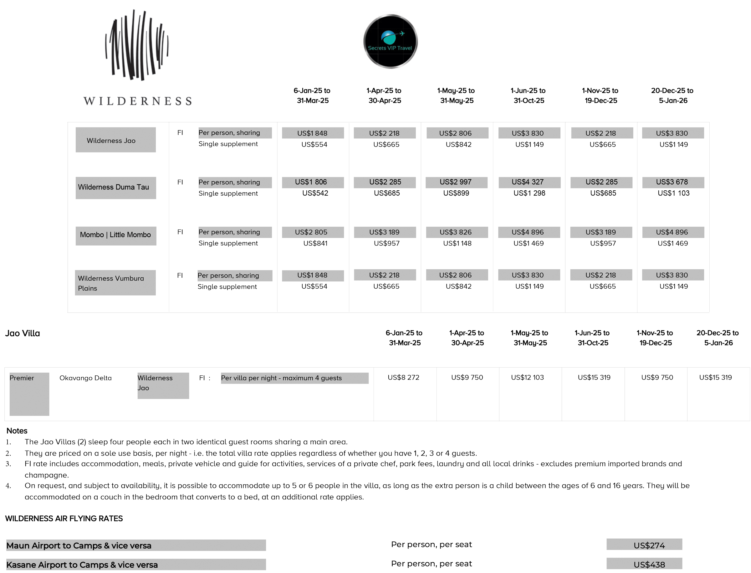 Secrets VIP Travel specializes in designing tailor-made luxury safaris throughout Southern and East Africa, with particular expertise in Botswana's Okavango Delta, Victoria Falls, Zambia's South Luangwa, and Tanzania's Serengeti. Our carefully curated portfolio features only the finest ultra-luxury safari lodges, including premier properties like Wilderness DumaTau, ensuring our clients experience Africa at its most refined and exclusive.